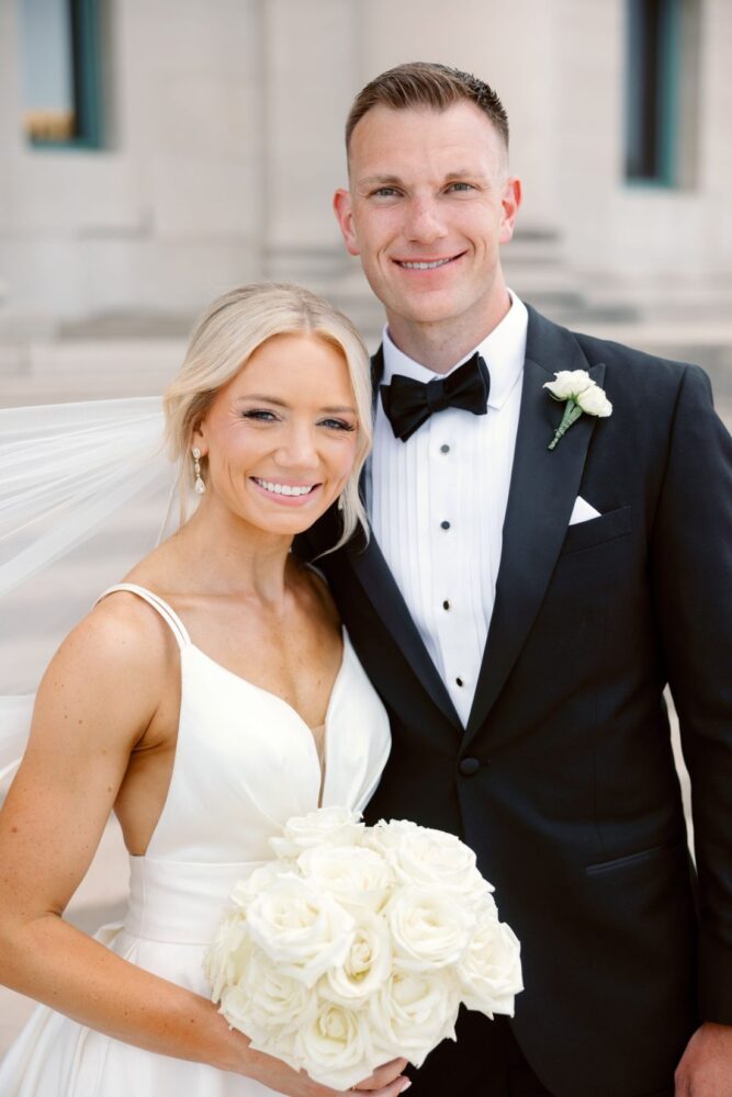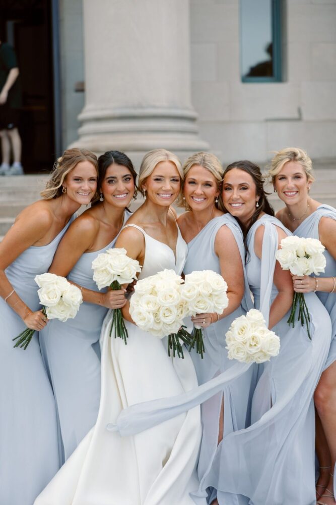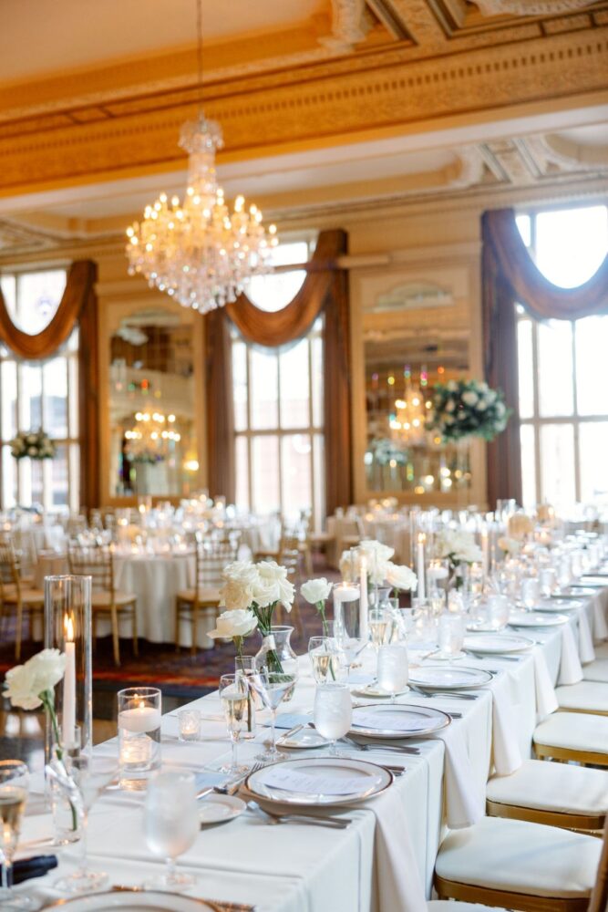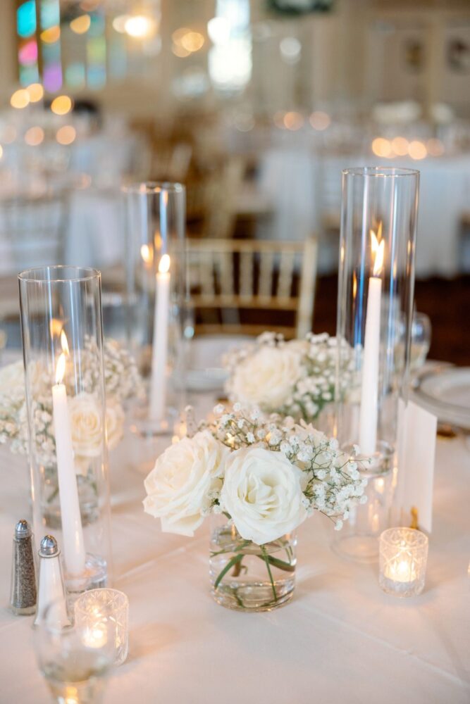 Sometimes, you just can’t beat a classic! This couple loved the look of roses and baby’s breath- a romantic and timeless combo. The wedding party bouquets and boutonnieres were simply gorgeous ivory roses bound with satin ribbon and gold accents. At the gorgeous MAC reception, our designers carried through the look with small bottles of roses and baby’s breath on some tables and tall, full arrangements on the others. All of the flowers were accented by various shapes and sizes of candles for a petal-softness and warm glow on all the tables.