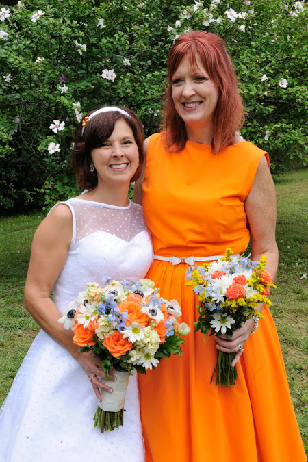 | Tammy’s bouquet was a mix of orange roses, light blue delphinium, butter stock flower, daisies, ranunculus, and anemones with dark centers. |