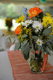 | The reception tables were decorated with jars of roses, daisies, delphinium, and solidago, accented with the bride’s polka dot ribbon. |