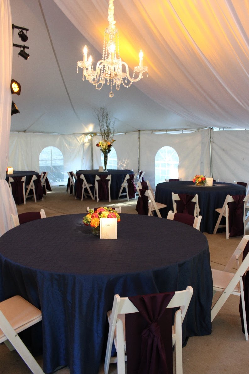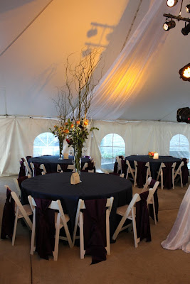 Inside the tented reception, we made tall and short centerpieces in bright fall colors that popped right off of the dark blue linens.