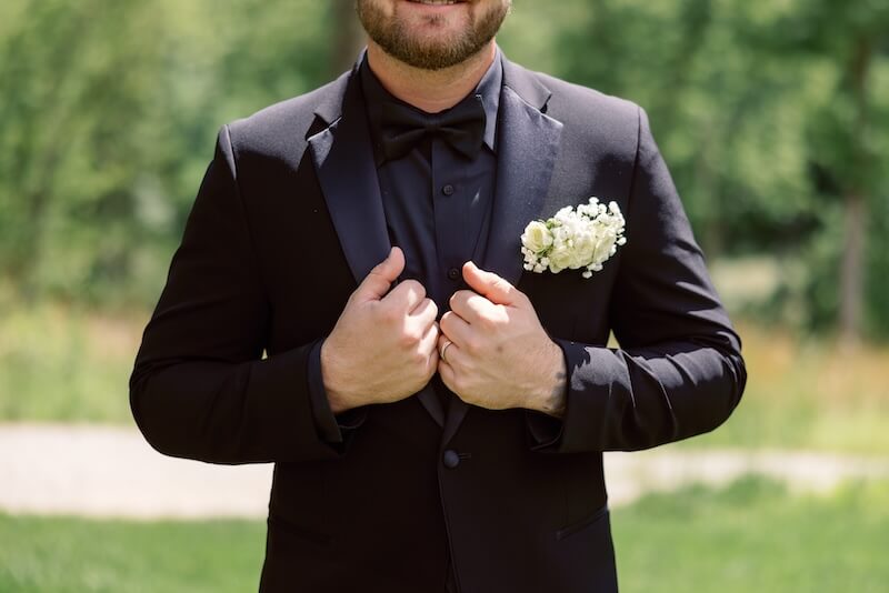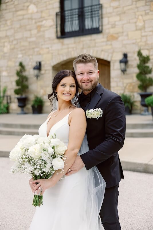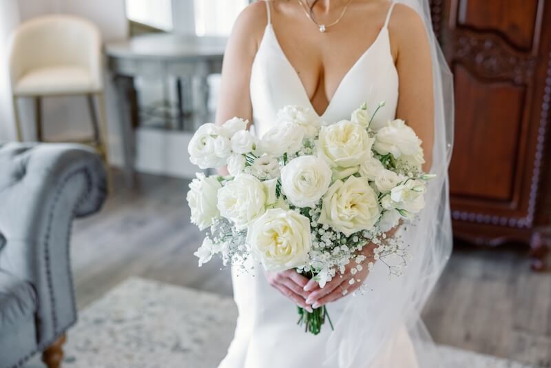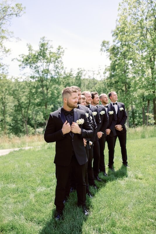The soft details of this Silver Oaks wedding included lots of roses, baby’s breath, & handsome pocket boutonnieres. The bridal bouquet featured an all white/ivory mix of roses, baby’s breath, roses, ranunculus, and lisianthus. Pocket boutonnieres for all the men complimented the bridal blooms with the same textures & flowers for each man’s lapel. Smart black & white details throughout the men’s attire were perfect with their white flowers.