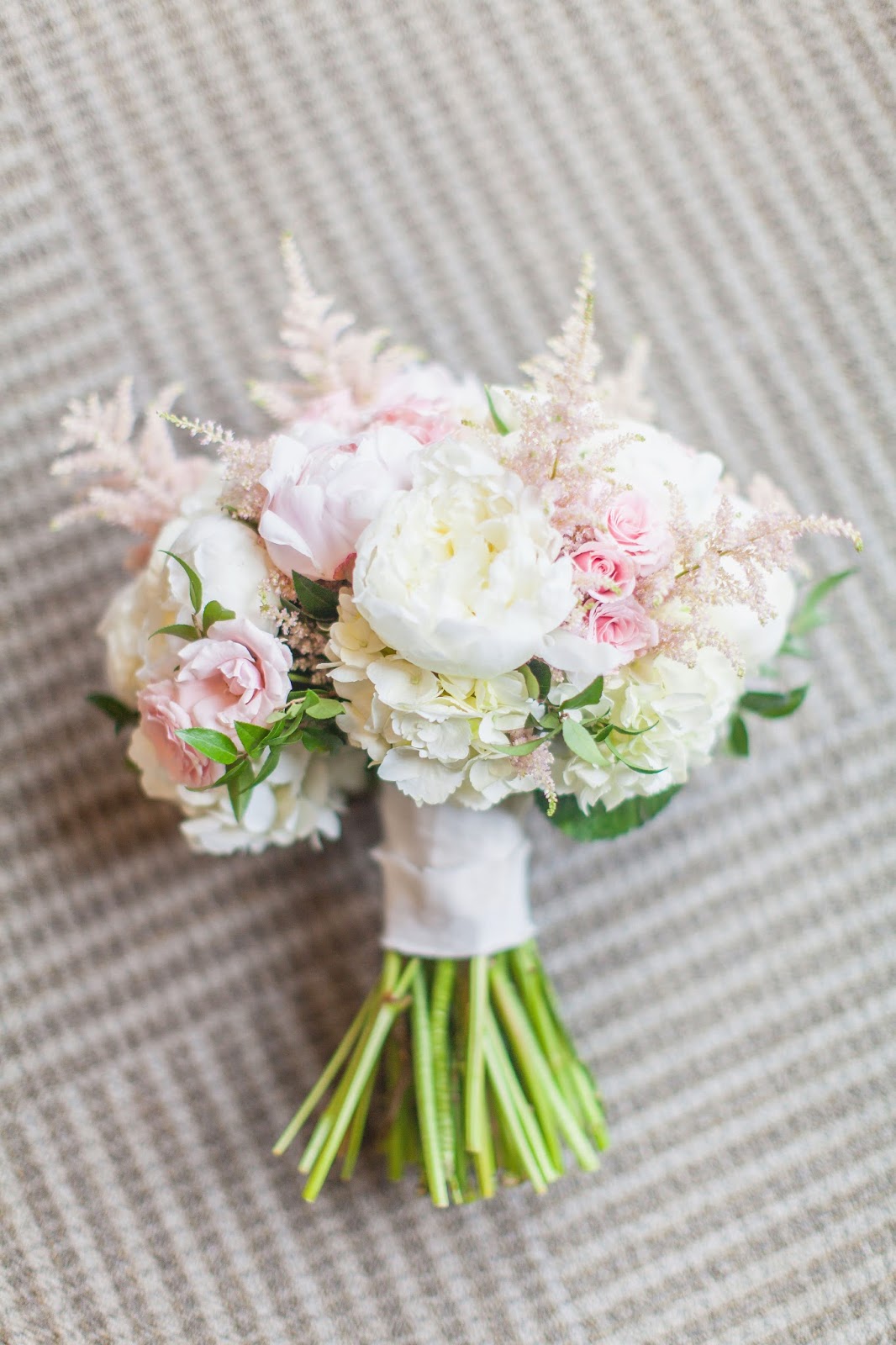 | Claire’s bouquet was a blush and ivory mix of peonies, astilbe, spray roses, ranunculus, and a touch of greenery. |