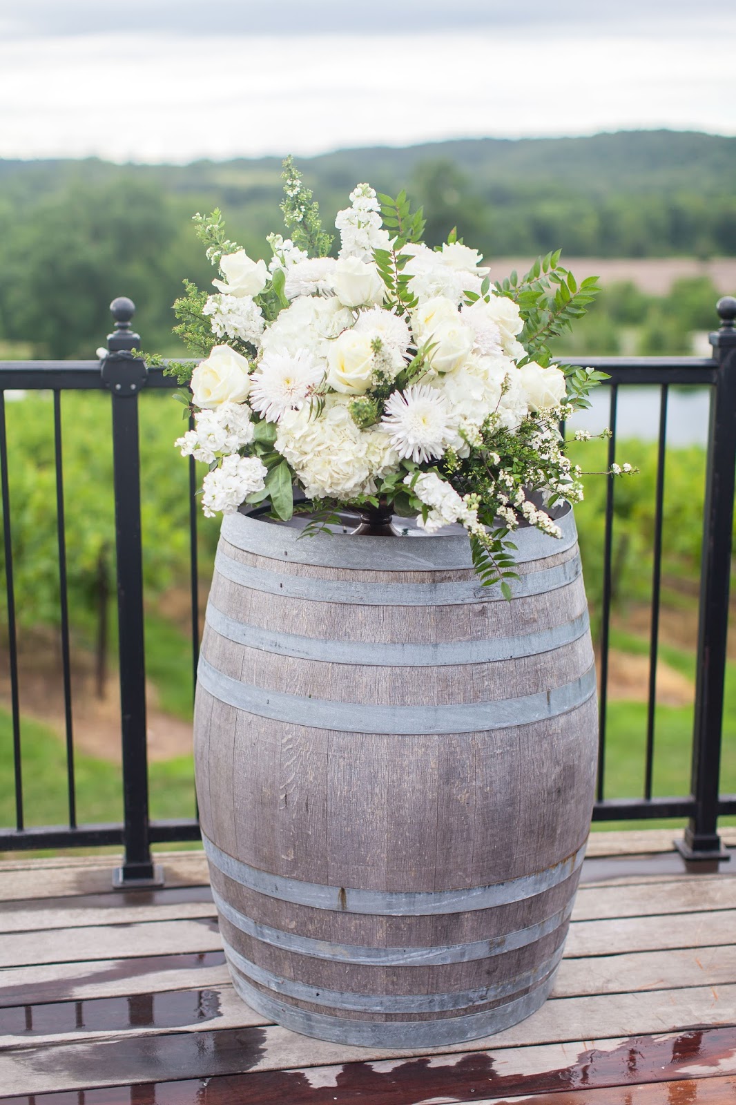 | Large arrangements of wedding flowers on wine barrels framed the vows and were used on the wooden bar for the reception afterwards. |