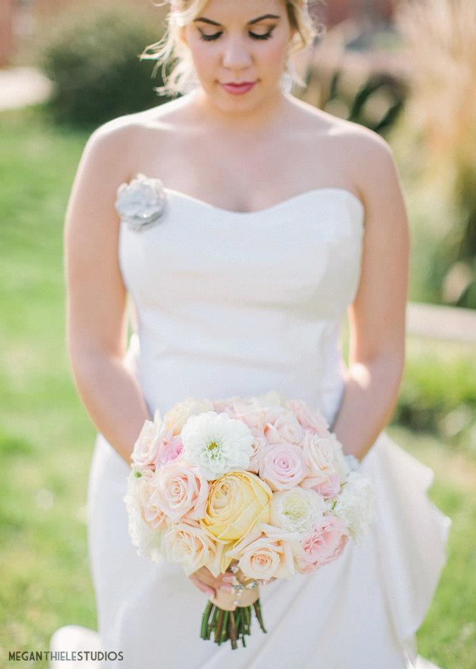 Allie and Michael were trend-setters with their wedding day color palette of blush, ivory, and gold in 2012. Looking back at these pictures just reminds us what a timeless look this popular combination was, has become and continues to be- even for weddings into 2017! We designed soft, romantic flowers for their autumn wedding in Colombia, MO. Photos by Megan Thiele.