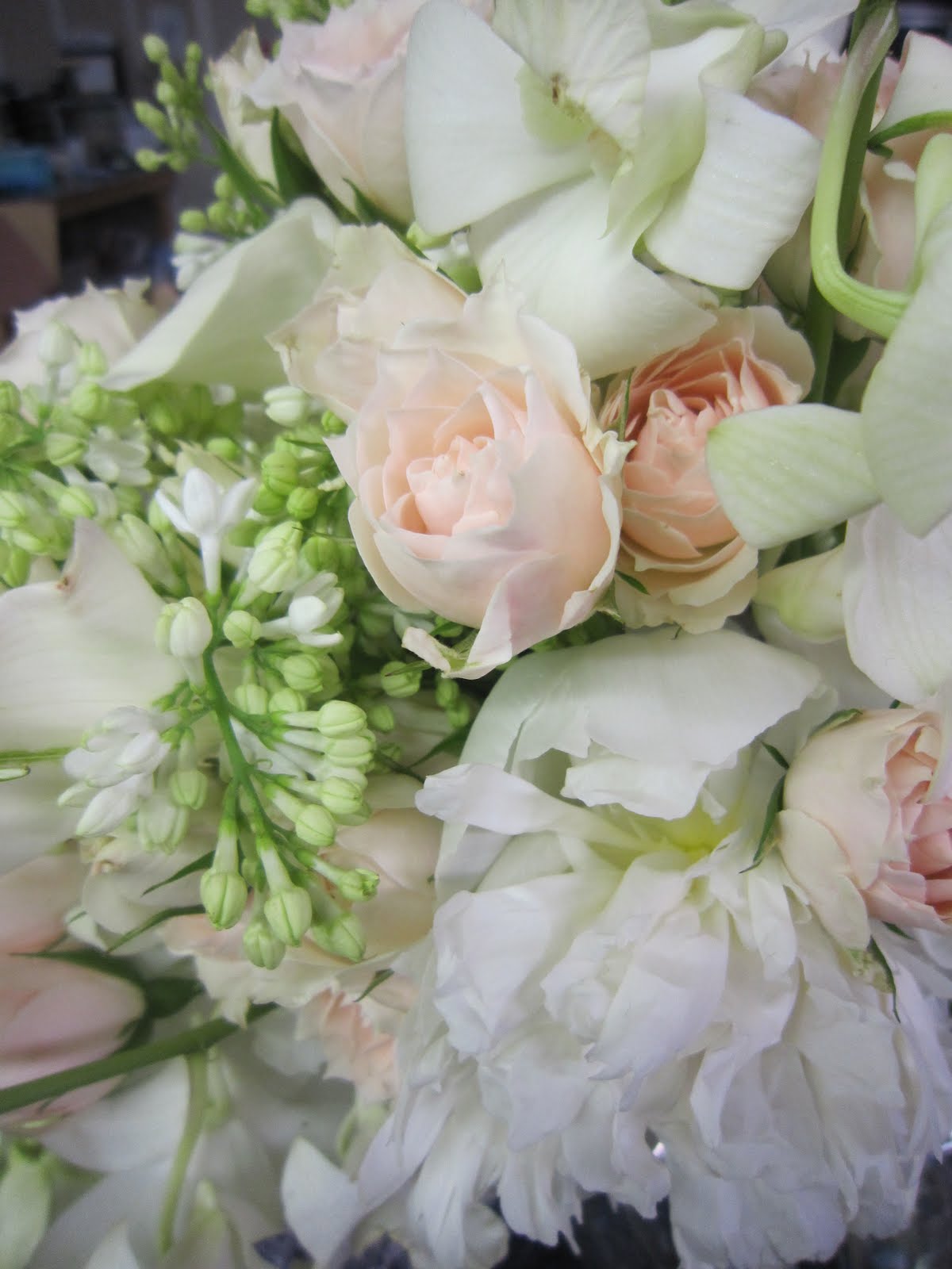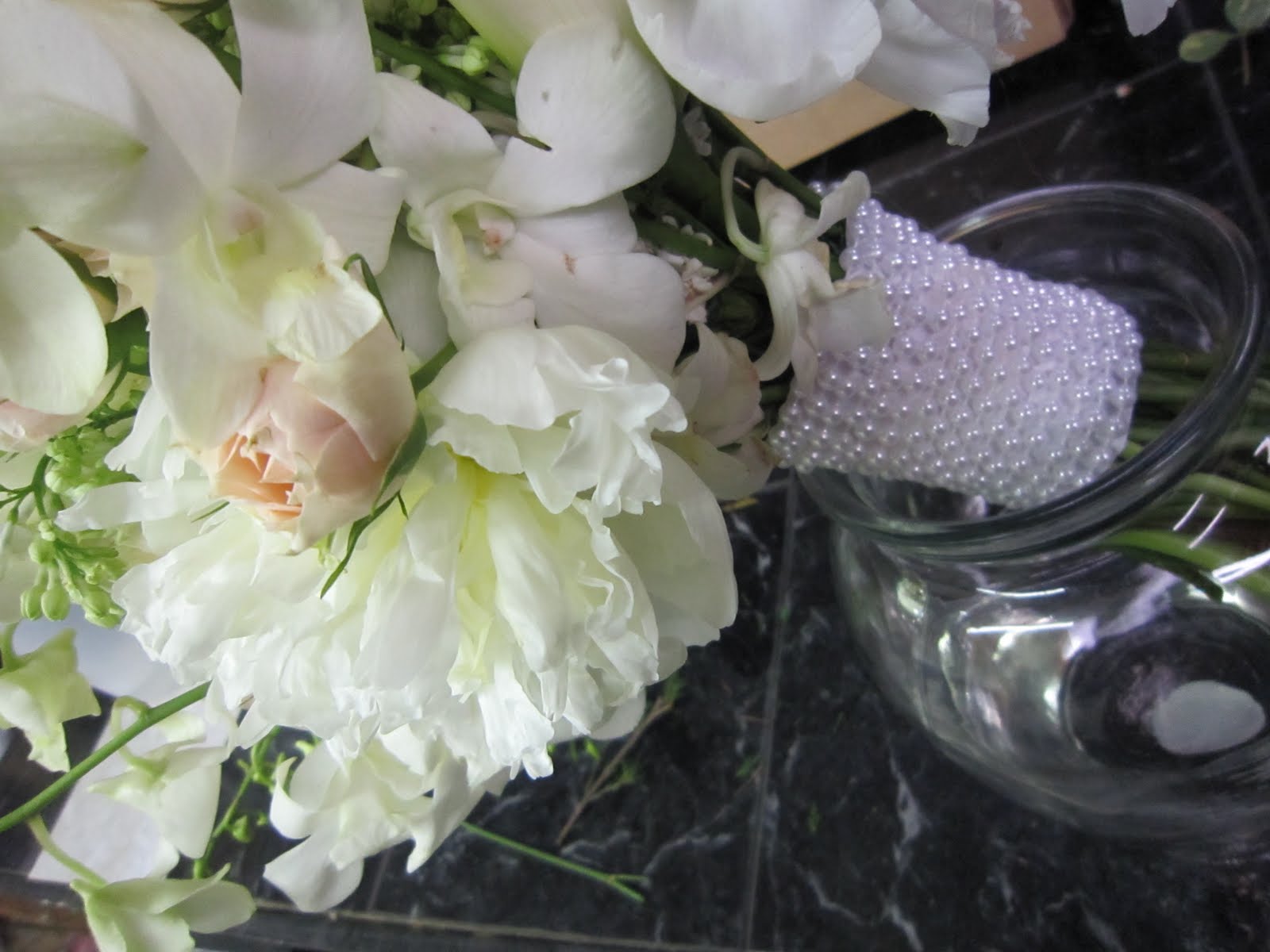 These snapshots are of one of the bouquets we took to the St. Louis Bride Magazine show at the Chase. It featured lilacs, mini callas and peonies with orchids and spray roses in a updated version of a traditional cascade. We wrapped the stems with pearl beads for an extra vintage touch. The bouquet had a lovely scent and showcased the soft textures of spring.