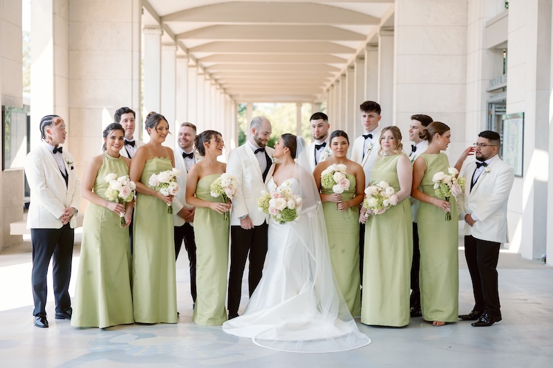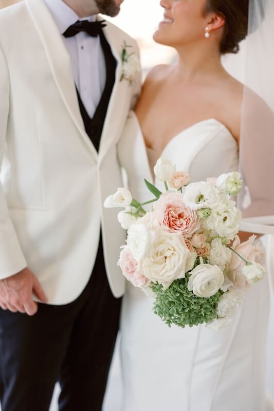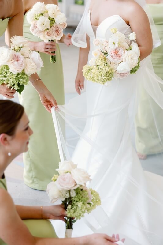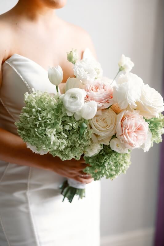 These bouquets were perfect for a fresh summer wedding. We used lime hydrangea (one of the bride’s favorites) offset with light pink garden roses, ivory standard roses, white ranunculus, and white tulips. We let the blooms be more natural in form, with flowers at different levels peeking out of the base of hydrangea. We love the look this created for the whole wedding party!