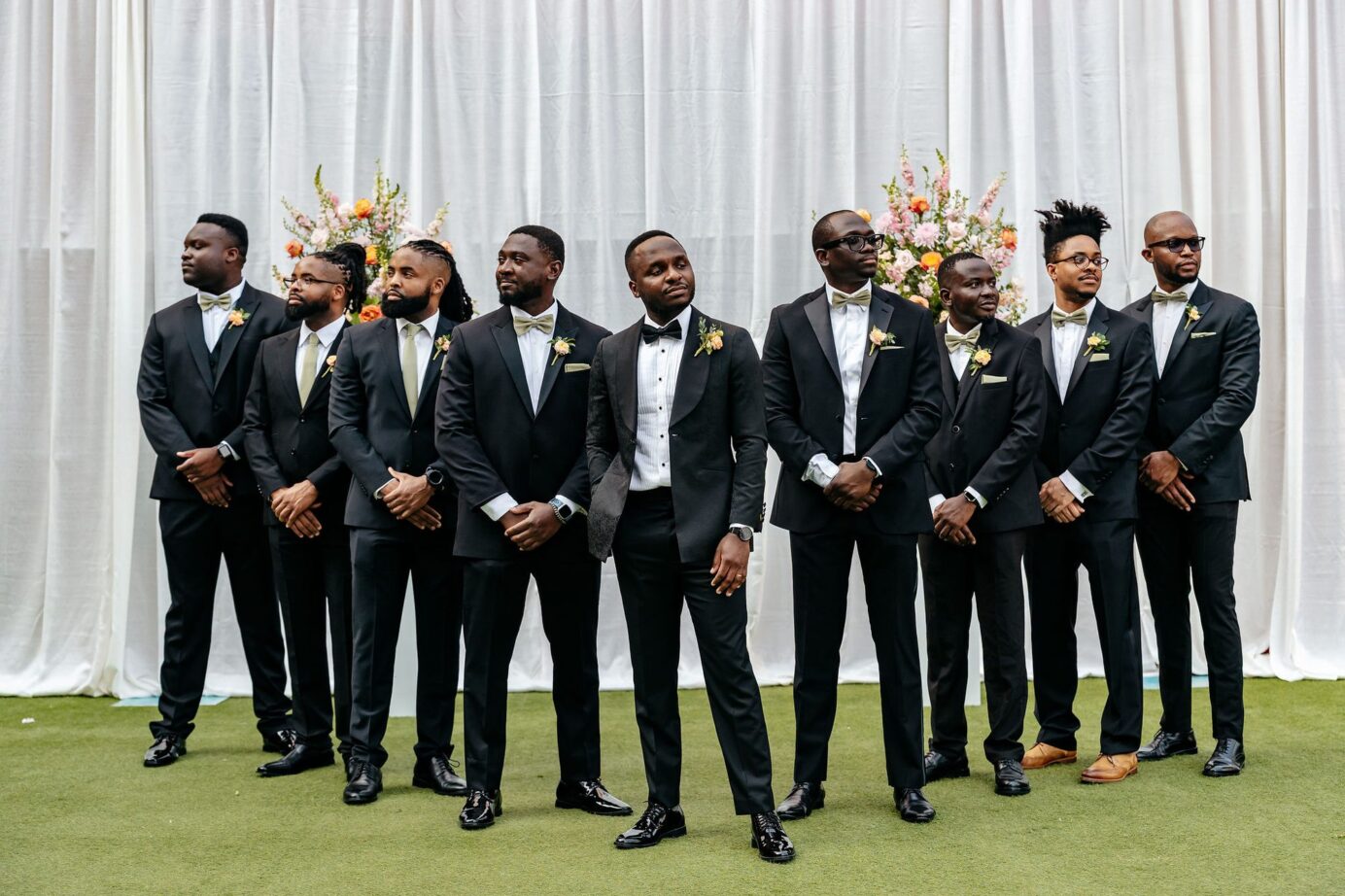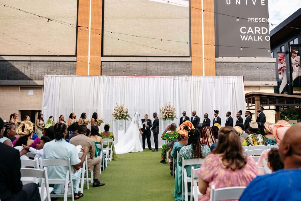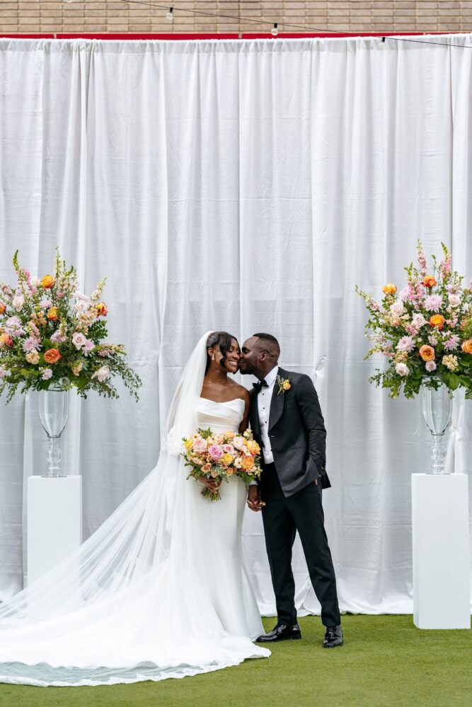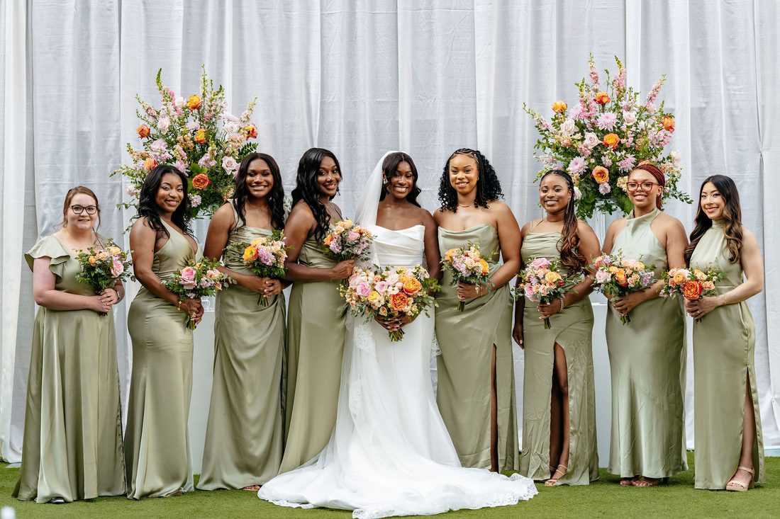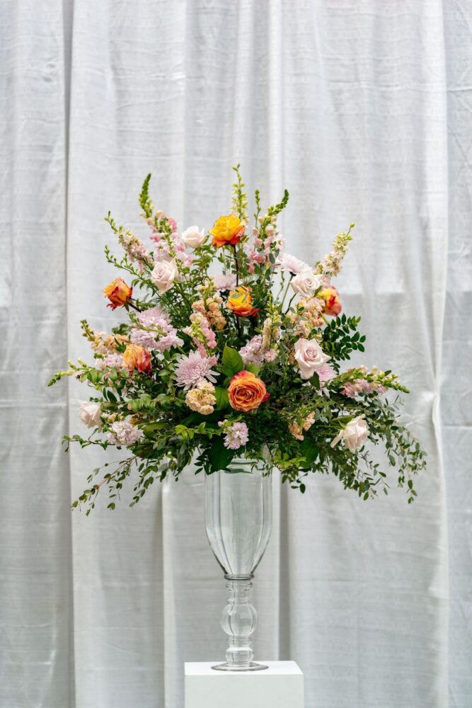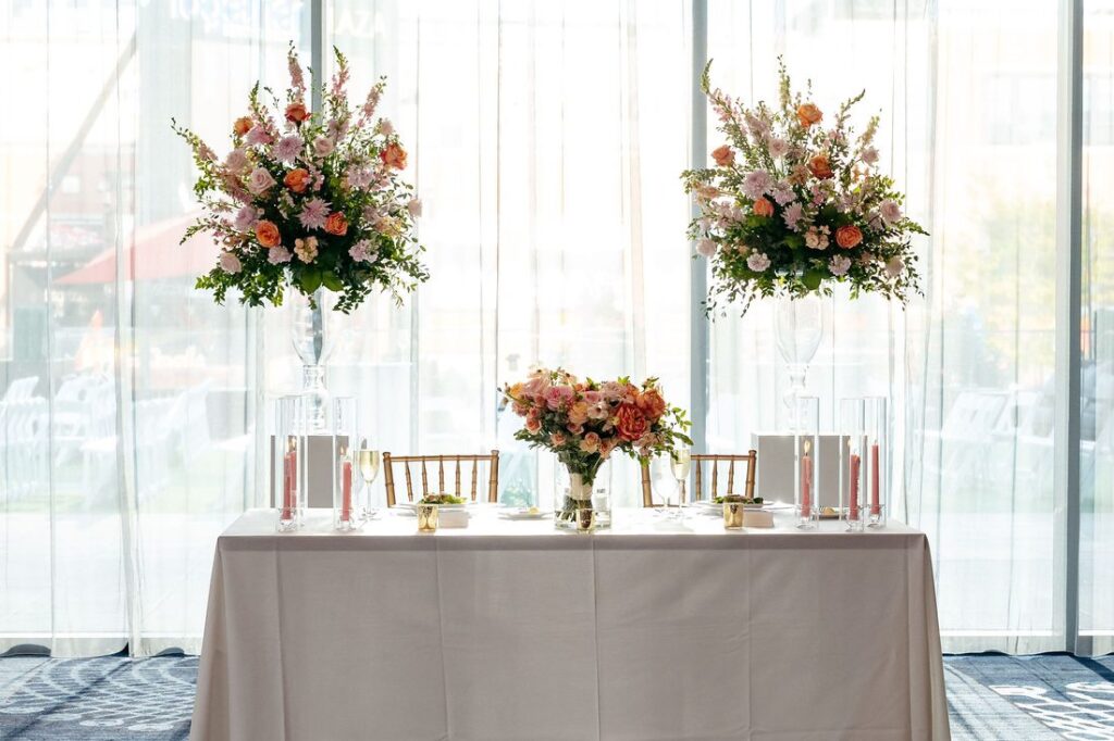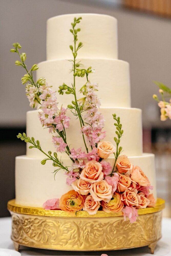 The lovely outdoor ceremony at Live! by Loews was full of colorful blooms and wonderful people! The wedding party’s attire was accented by pops of bright garden roses, spray roses, and ranunculus with soft undertones of stock flower and standard roses. The backdrop to the ceremony featured two glass urns full of wedding blooms that flanked the bride and groom. These urns were moved to the reception to frame the sweetheart table. The same flower tones used during the nuptials accented the reception room and cake. We loved these textures and tones for this sweet couple!