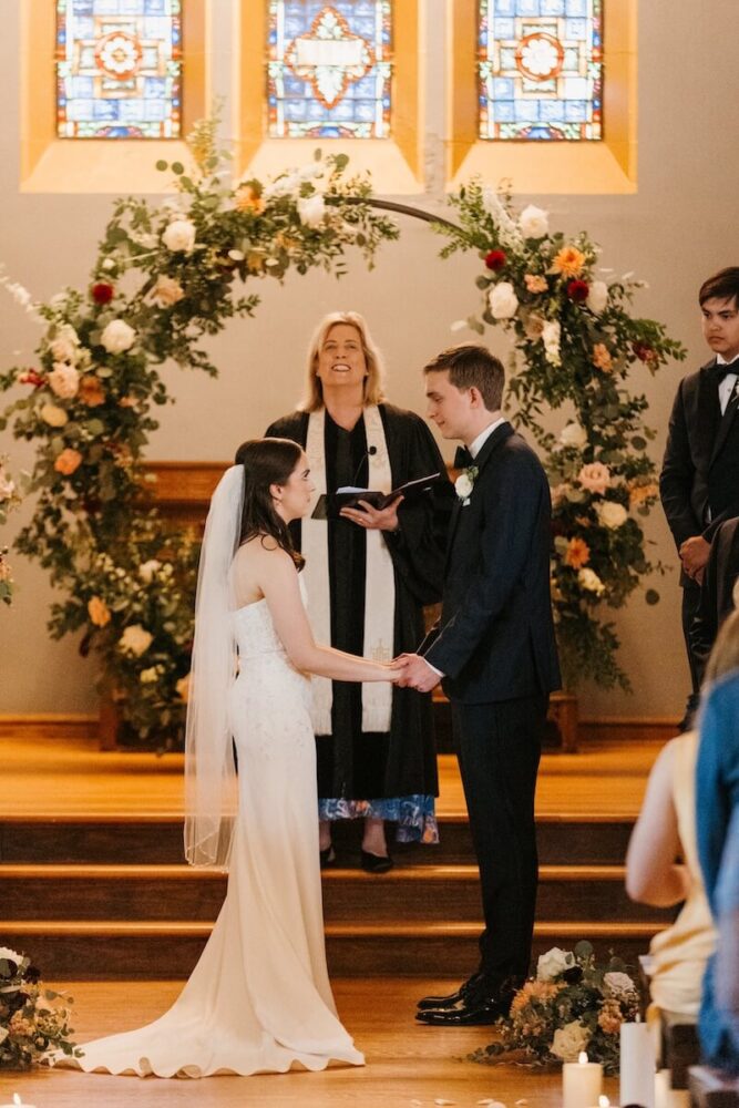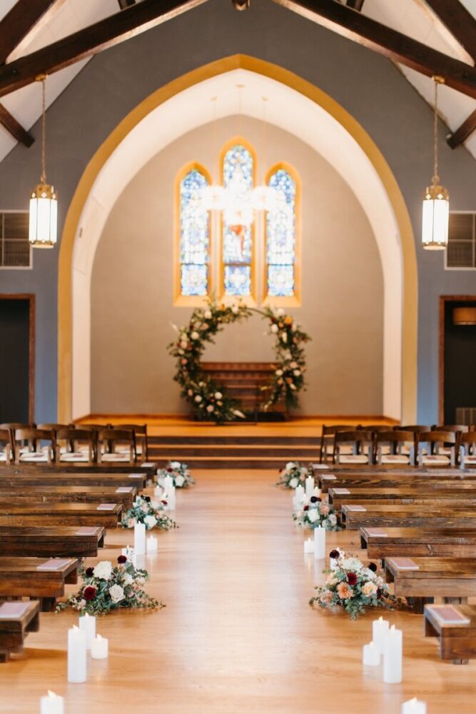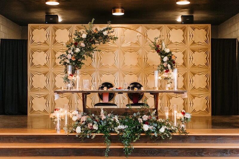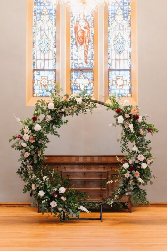 This circle arbor did double-duty as a stunning backdrop for both a wedding ceremony & a sweetheart table at the reception. The ceremony aisle at the Leona was lined with flowers & candles making a romantic path to the circle arbor- full of the same flowers & greenery- roses, cremones, larkspur, eucalyptus, & huck. All of the flowers were moved after the ceremony & the arbor was used to frame the bride and groom behind their table at the same venue. All the romantic textures of the ceremony flowers surrounded the couple during the toasts, dinner, and dancing.