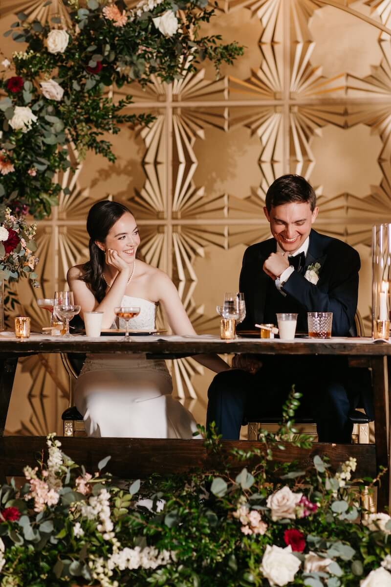 This circle arbor did double-duty as a stunning backdrop for both a wedding ceremony & a sweetheart table at the reception. The ceremony aisle at the Leona was lined with flowers & candles making a romantic path to the circle arbor- full of the same flowers & greenery- roses, cremones, larkspur, eucalyptus, & huck. All of the flowers were moved after the ceremony & the arbor was used to frame the bride and groom behind their table at the same venue. All the romantic textures of the ceremony flowers surrounded the couple during the toasts, dinner, and dancing.