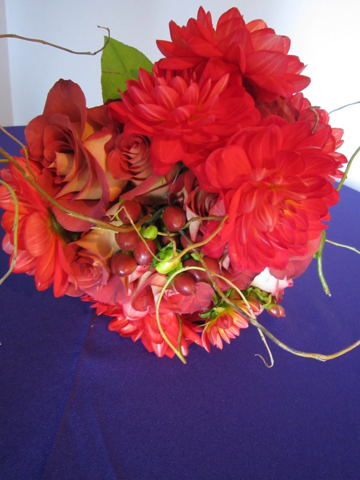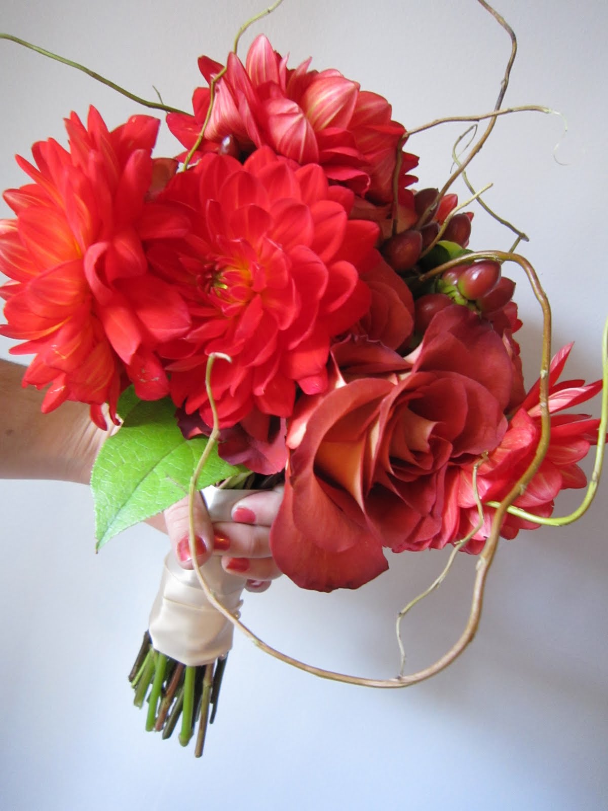 The bridal bouquet included dahlias, berries, roses and willow.