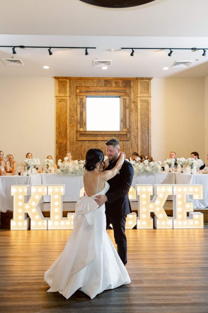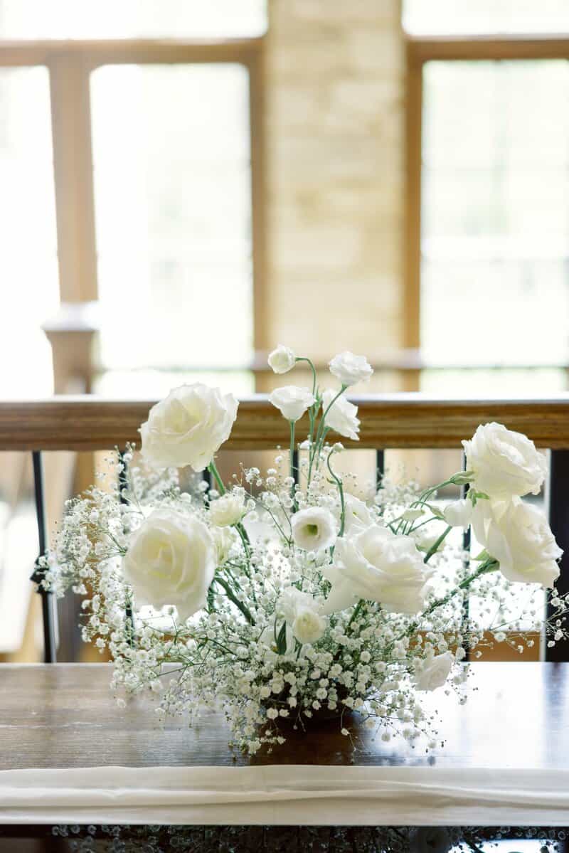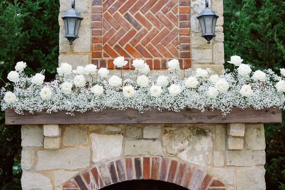 Silver Oaks Chateau is simply one of our favorite venues. This wedding, packed full of roses and baby’s breath, was such a joy! We covered the outdoor fireplace mantle with a hedge of baby’s breath and roses. It was a lovely backdrop for the couple’s vows. The aisle was lined with the table centerpieces that we swiftly moved to the guest tables after the ceremony ended. The fireplace pieces quickly became head table decor and graced the backdrop of the newlyweds’ first dance. We love giving our designs double-duty to bring TWICE as much beauty on such a special day.