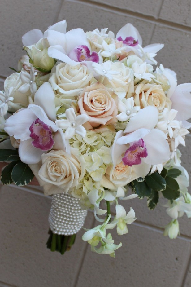 One of our lovely brides from 2010 brought in this inspiration photo. She really liked the lushness and texture of this bouquet and fell in love with the pearl detail. At Sisters, we always want to give the bride whatever she wants for her bouquet. So, we took the bride’s inspiration and used our special touch to make her magazine photo come to life for her wedding day. Take a look.