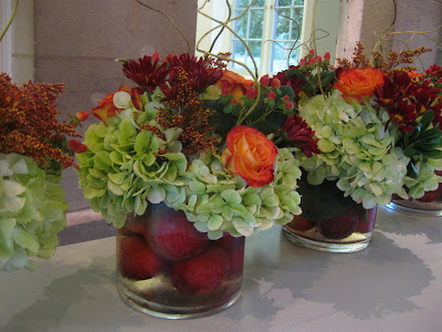 Sisters designed these lush, fall arrangements for a rehearsal dinner last October. Our clients wanted to incorporate lots of texture and interest for the season. Fall roses, hydrangea, daises, berries and curly willow worked well together in the arrangements. We used red apples inside the cylinder vases to continue the fall color low on the table.
