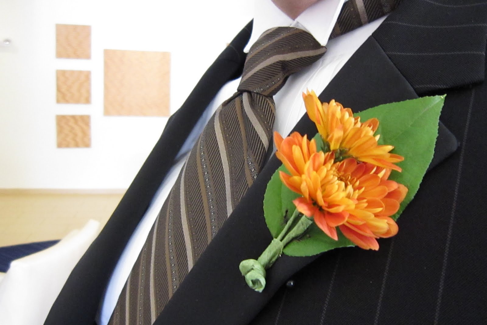 Derek wore this flame mini calla bout. with red berry accent to match Angela’s flowers.