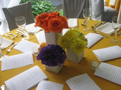 The reception, held in the backyard under a tent, was bright and colorful like the ceremony. Each guest table had three different vases with three different types of flowers in wedding colors.
