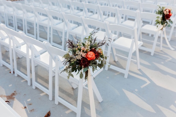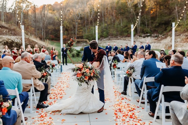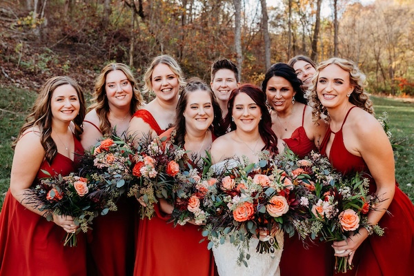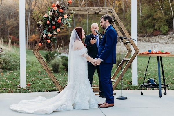 When the Missouri weather cooperates, an outdoor wedding can be simply spectacular!  This was certainly the case for these two lovebirds.  The outdoor patio at Pine Hollow Farms was the perfect canvas.  We decorated the venue’s hexagon arbor with fall tones in burgundy, peach, sherbet, and rust.  The aisle also showcased clusters of the fall flowers on the chairs as well as petals sprinkled in the wedding colors.  The wedding party carried bouquets of roses, disbuds, stock flower, seeded eucalyptus, and dark agonis greenery. It was the perfect day for an outdoor wedding!