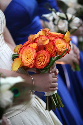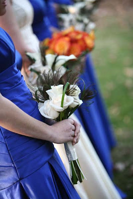The feathers were used to tied in shades of blue in the bridesmaids’ bouquets. They carried white calla lilies, ivory roses, accented with the peacock feathers and looped lily grass.