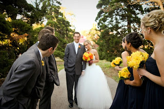 | The bridesmaids bouquets were clusters of all yellow dahlias and roses that popped off of their navy dresses. |