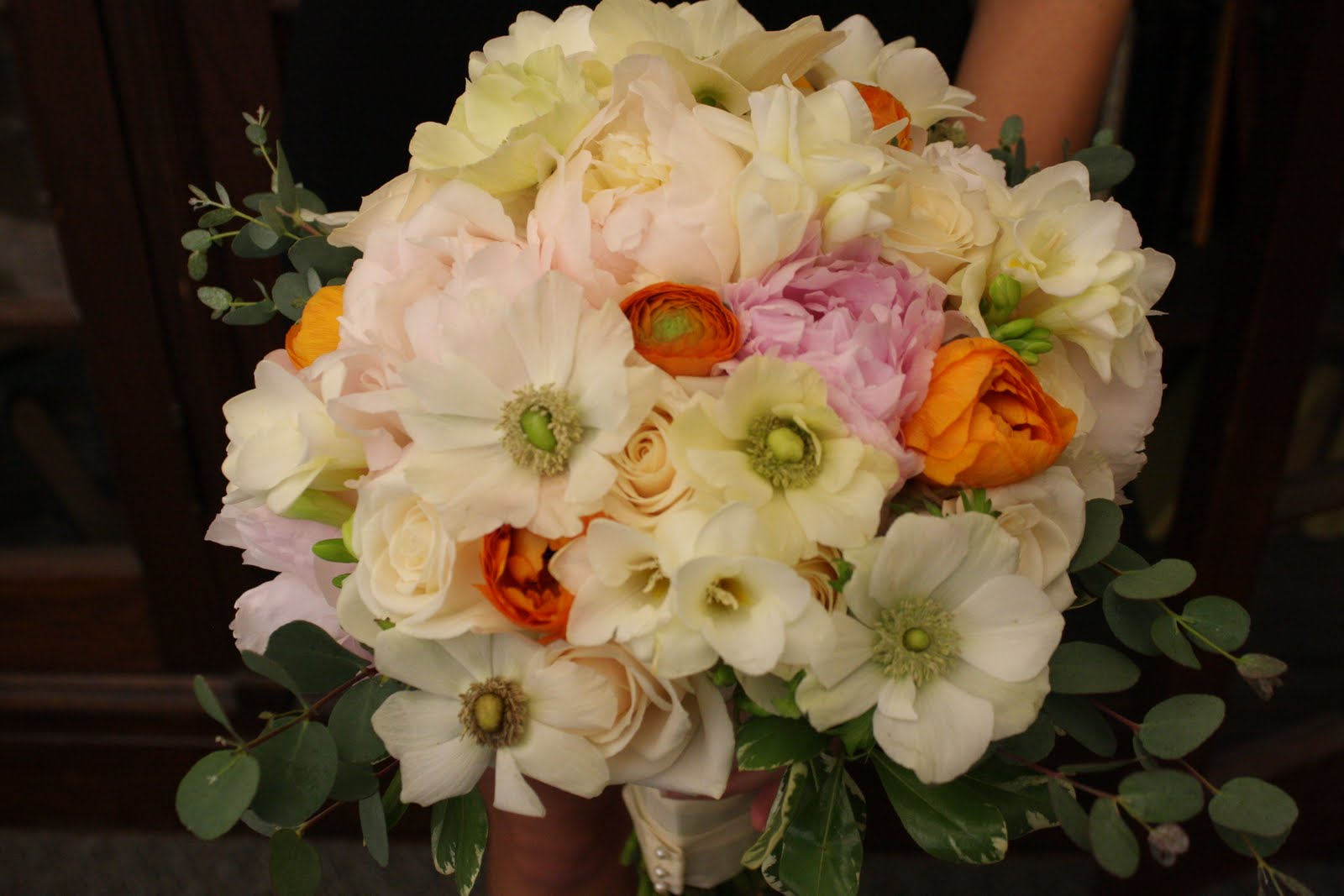 Another bride we had that same weekend also used a pastel color scheme and added in pops of orange. Her bridal bouquet was a very sweet mix of ivories and blush pinks with bright orange ranunculus to accent.