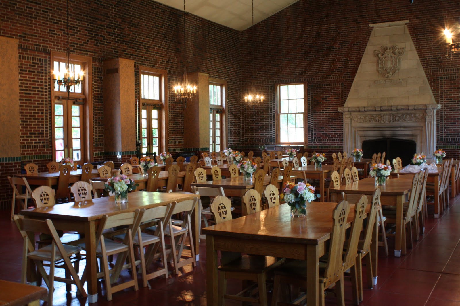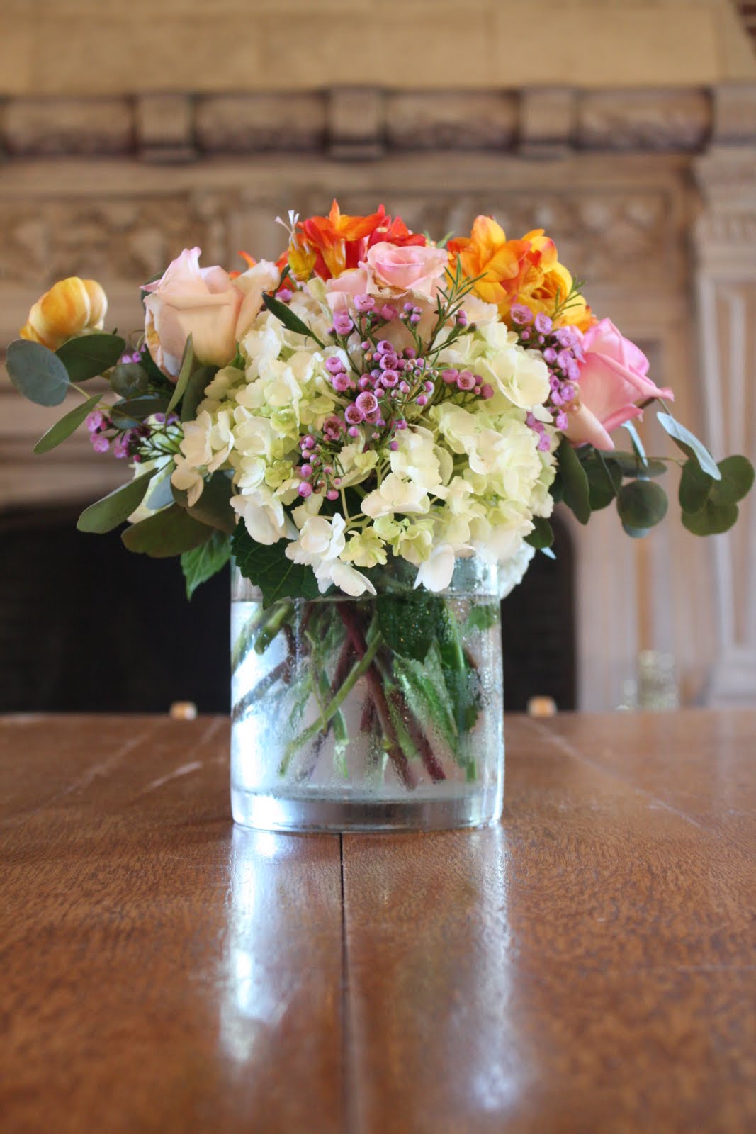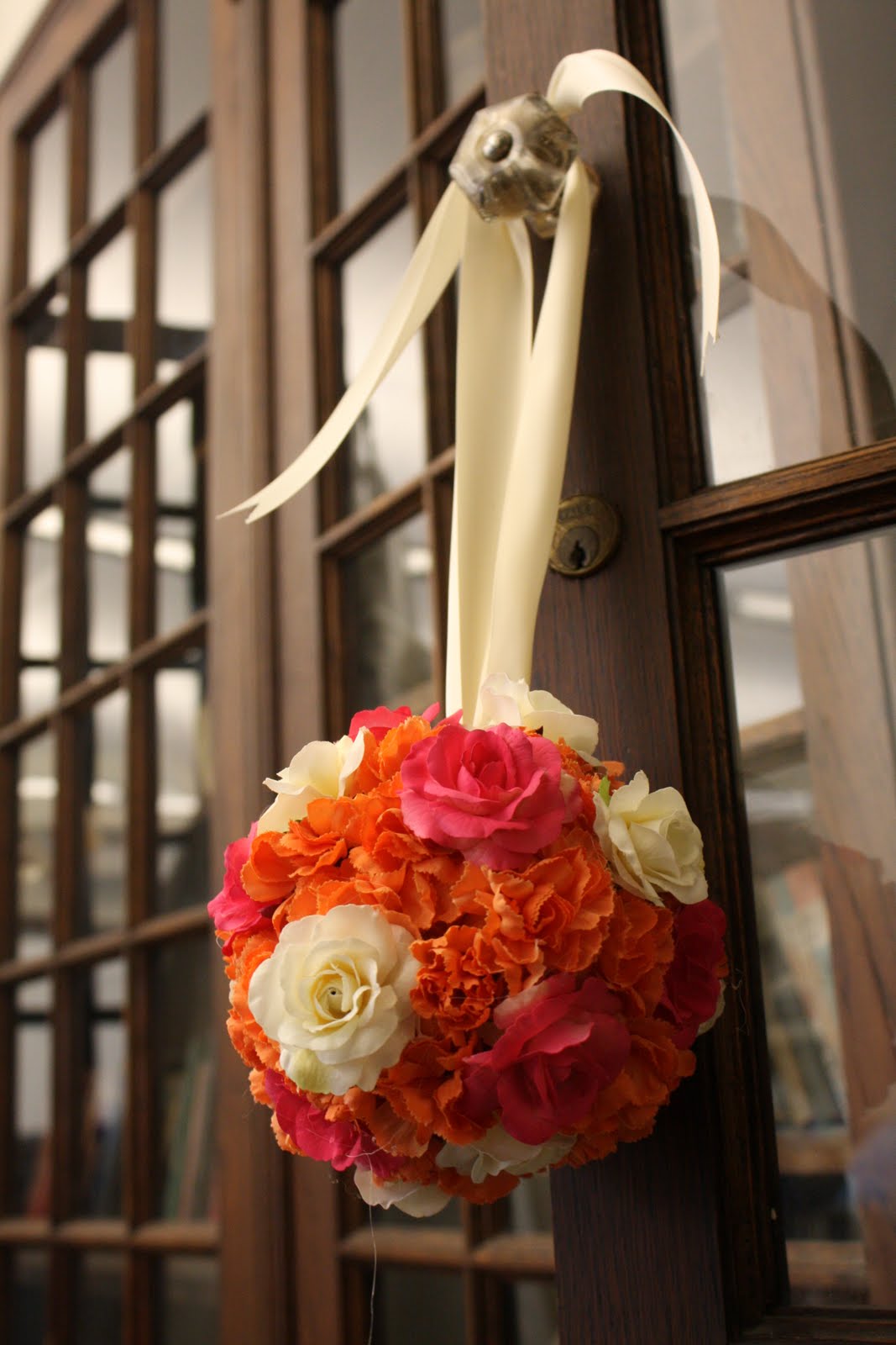 The centerpieces at Eden Seminary also had pops of orange mixed in with