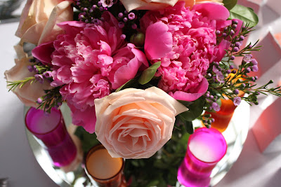 The centerpieces at the Piper Palm House carried through the pastel peaches and pinks with the pops of pink peonies.