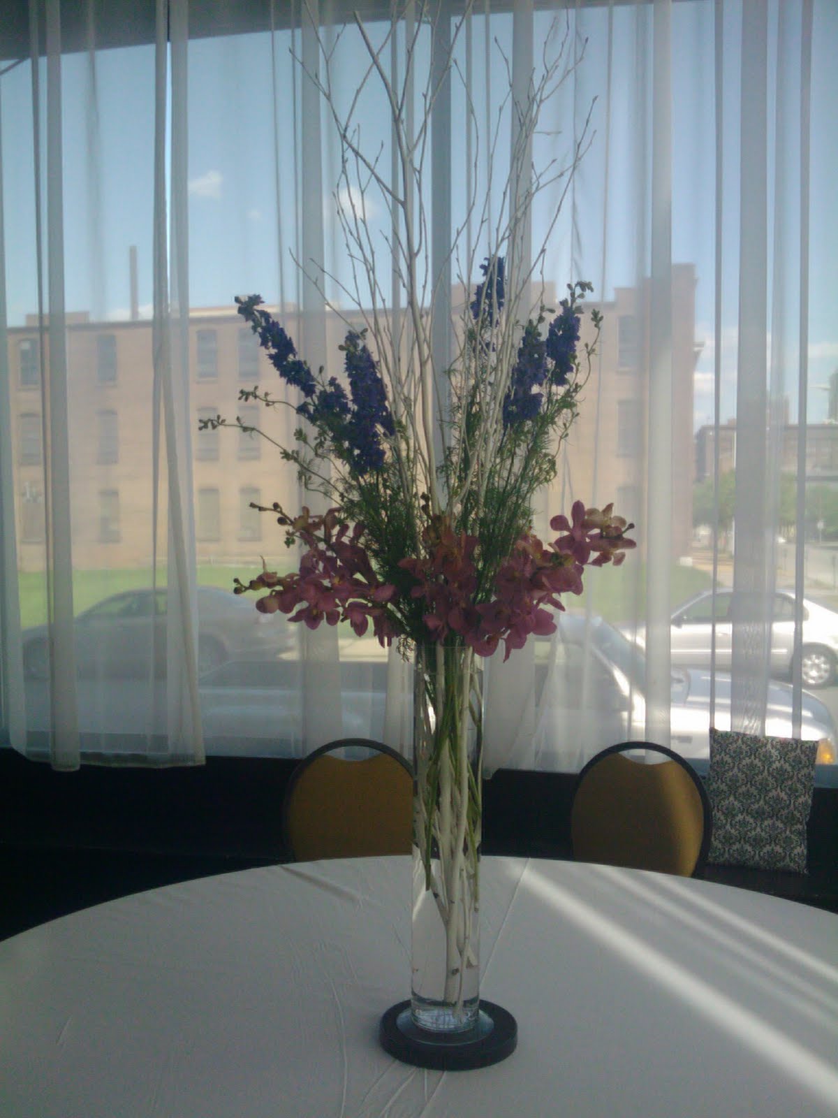 The clusters included three vases all of one type of flower- blue delphinium, blue hydrangea and purple stock. The tall centerpieces were white birch branches with purple larkspur and makara orchids. The whole arrangement was up-lit with an LED disc.