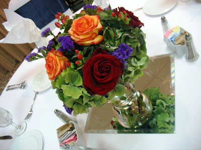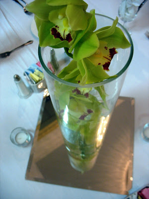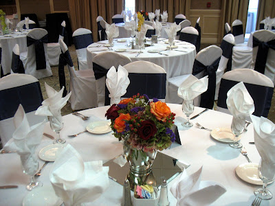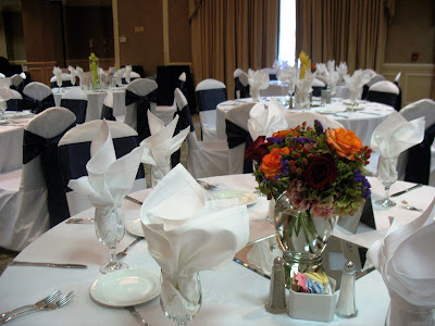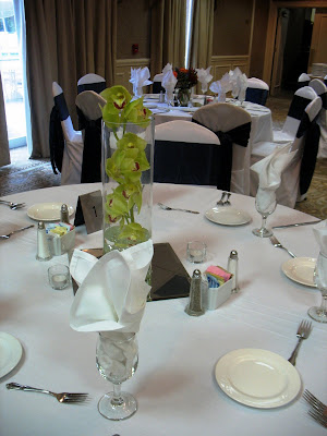 Submerged cymbidium orchids in bright green and gold decorated half of the guest tables at this October reception at the Crowne Plaza in Clayton. The other half of the tables had lush, full arrangements of fall flowers including hydrangea, roses, berries, and filler. Take a look at these snapshots that our very own Sister, Chelsea, took at set-up.