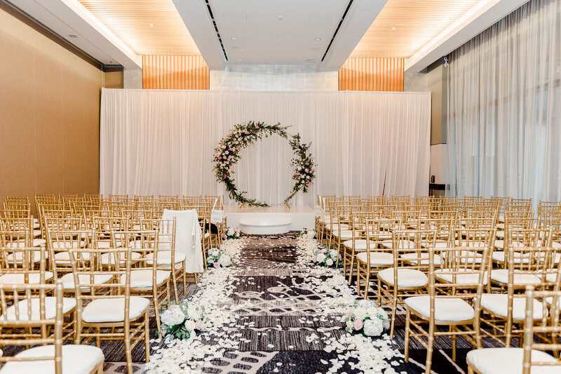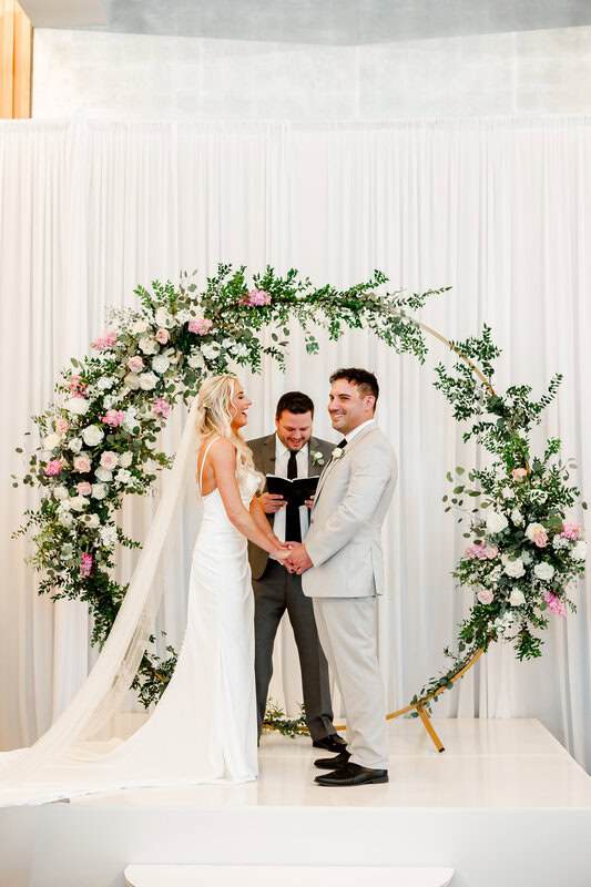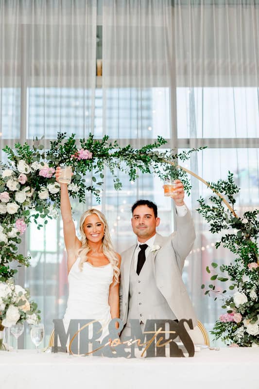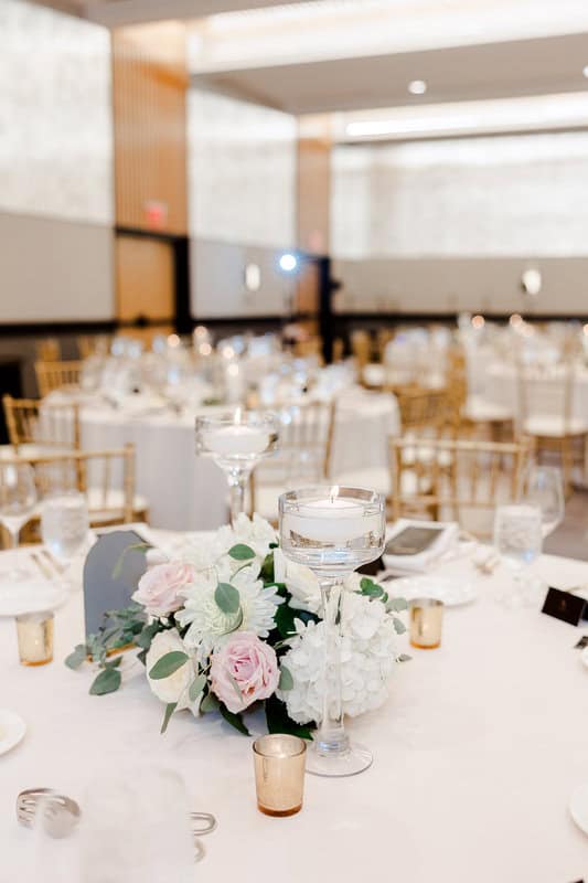 Live! by Loews was a fun spot for this spring wedding. Our circle arbor was decorated with a natural-looking mix of light pink and white roses, stock flower, & hydrangea. The aisle was lined with rose petals and the table centerpieces that we magically moved to the guest tables after the vows. The reception featured light pink and white blooms again as well as the circle arbor that was moved behind the head table. Here’s to the happy couple!