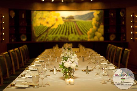 | A dinner was held in the restaurant for all the guests. Small arrangements lined the middle of the large table. |