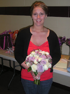 Here is the new Mrs. Katie Griffin with her very spring-like bouquet of ivory and lavender roses, ivory spray roses, ivory ranunculus, and an accent of pink waxflower filler. Perfectly soft and pretty for a spring wedding!