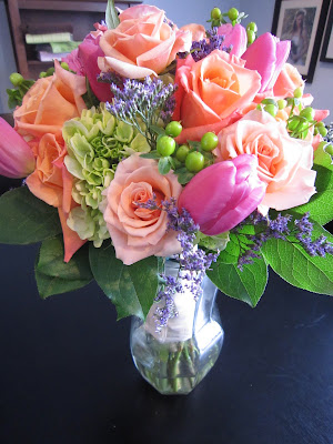 Spring is in the Air! Take a look at this yummy bridal bouquet. Coral roses, bright pink tulips, green hydrangea, berries and purple filler all remind us that spring is here! We had fun with this vibrant combo!