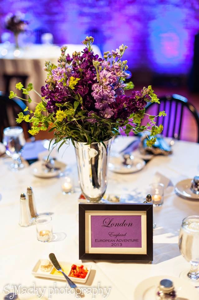 | After the ceremony, the guests moved upstarts to the Centennial Ballroom for the reception. The tables were decorated in all lavenders and purples. Two different centerpieces were used to give varying heights and designs to the tables. |