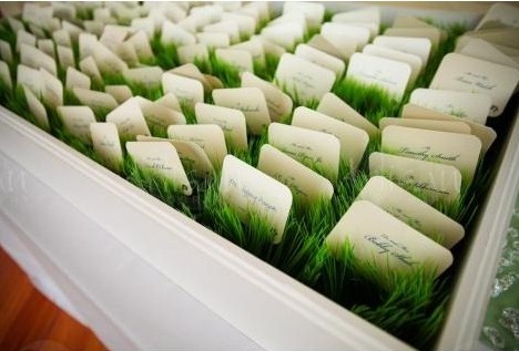 The bride and groom rented this white box filled with grass from Sisters Flowers. They used it at the entrance of Lumen for their place cards.