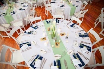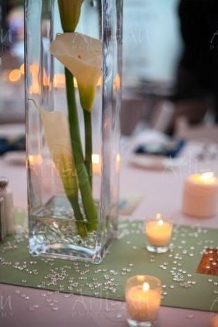 Different white flowers for each guest table were chosen to be submerged in tall rectangle vases.