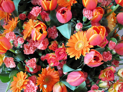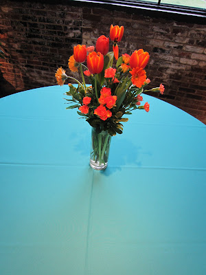 The flowers were a bright mix of oranges including roses, gerber daisies and tulips. The centerpieces alternated high and low vases for some table variety.