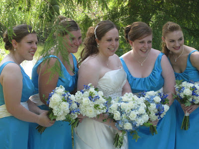 Mary’s wedding was this past August. She also used blue and white as her wedding colors. Her bouquet was a loose, lush bouquet in whites and blues.