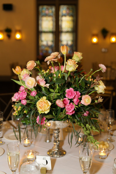 | The centerpieces had the same natural look with the addition of the formal silver compotes. |