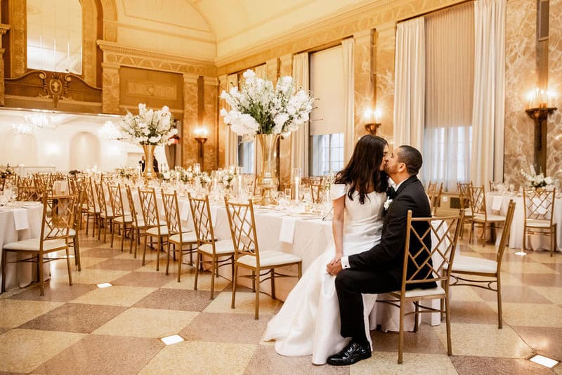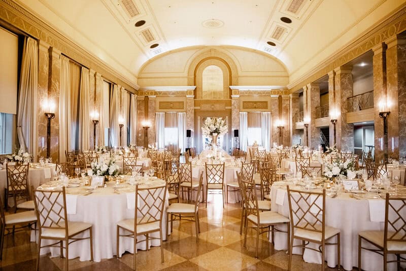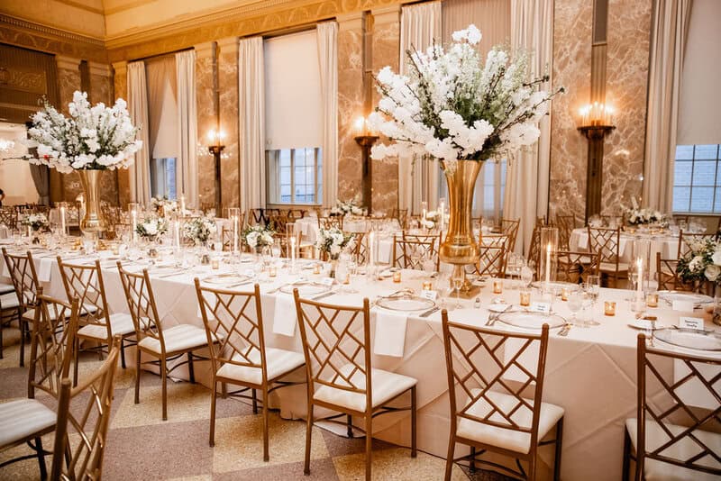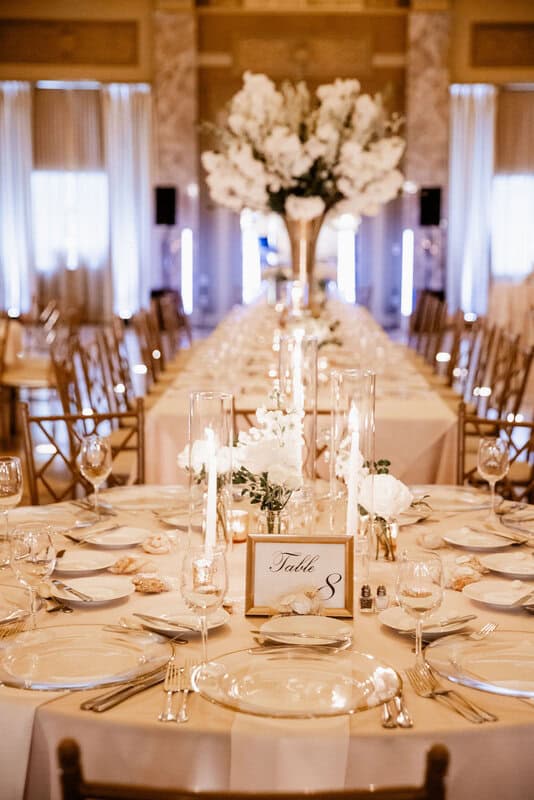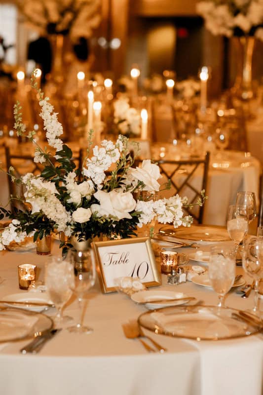 We love working at the Coronado Ballroom. Its lavish gold room accents are so warm and inviting for any event. This wedding celebration embraced the room by accenting it with traditional white florals and candlelight. Tall gold urns were used on the head table- overflowing with blooming branches and spring flowers. The guest tables showcased the spring season with fragrant rose blooms and accents of larkspur to mimic the blooming branches of the head table. Tall taper candles gave the perfect glow to the tables for the guests to enjoy. There’s just something about classic gold and white!