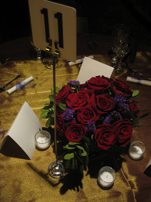 The centerpieces were full arrangements of red roses and purple filler in cube vases. Two different heights of the same arrangements were used.