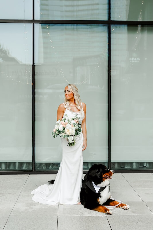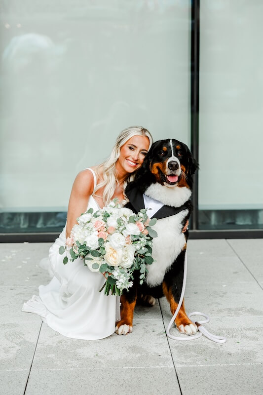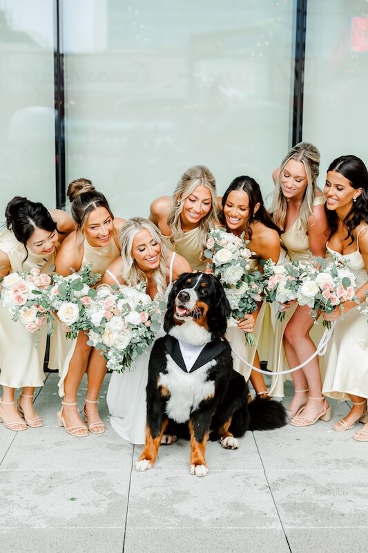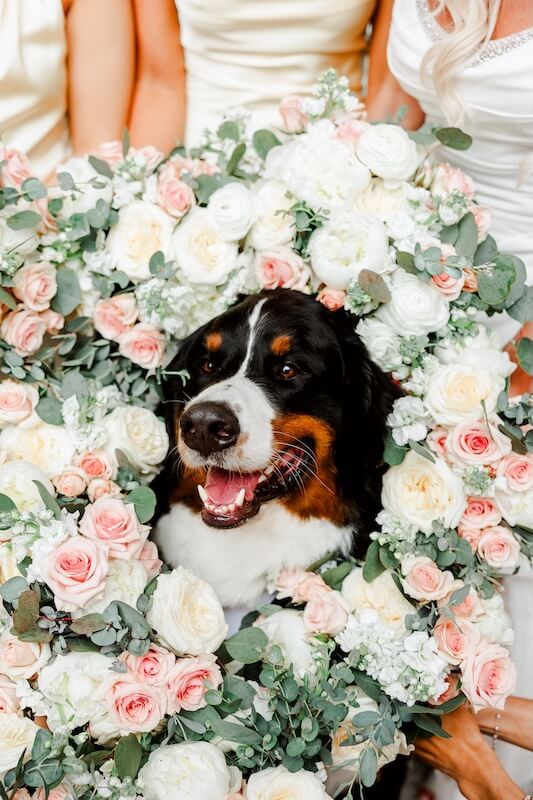 Furry friends & flowers go perfectly together! This sweet pup was a fashion icon in his tuxedo & he was so proud of his special bride. It was cuteness overload! All of his lovely human friends carried blush and ivory bouquets of roses, spray roses, peonies, and stock flower. We will always be a fan of this dapper doggie!