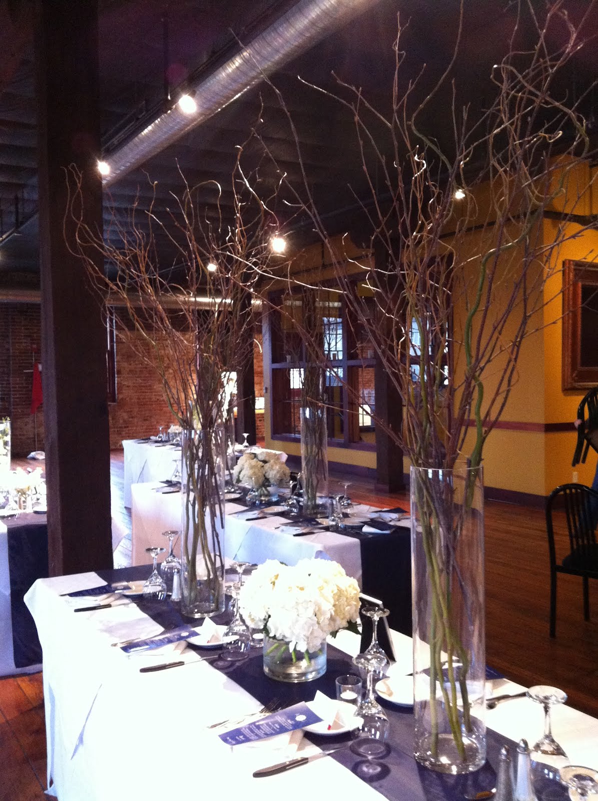 All the guest tables were long and sat people all the way around. We came up with three different table layouts mixing white flowers and branches throughout the room.